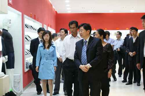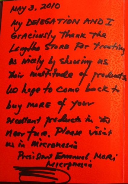 浪莎集團領導和義烏市領導熱情地接待了莫里總統,并陪同莫里總統參觀了浪莎廠區及產品。在“浪莎”的產品展示區,莫里認真了解了我市市場演變的歷史過程和“浪莎”的發展蛻變,竹纖維產品、莫代爾纖維產品、大豆產品、亞麻產品等高科技襪讓莫里總統贊不絕口。尤其對浪莎毛巾非常感興趣,隨即拿起一條條各色款式的毛巾仔細翻看,他說,這些毛巾質地十分柔軟舒適,外觀也十分漂亮,價廉物美,讓他“一見傾心”。當時就預訂了大量毛巾和T恤。臨別時,莫里總統還在浪莎“嘉賓提名薄”上寫道,他及他的代表團非常感謝浪莎的熱情款待,帶他們參觀浪莎產品。我們希望在不久的將來到你這里買更多的好產品。非常歡迎并希望浪莎人到密克羅尼西亞回訪他。