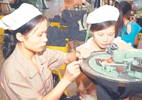 昨日,浪莎控股集團(tuán)對(duì)目車間的邵紫紅(左)、邵紫敏(右)姐妹倆正在縫制襪口。今年28歲的邵紫紅和25歲的邵紫敏是江西廣豐人,2002年雙雙被招入浪莎控股集團(tuán)對(duì)目車間。進(jìn)廠后,姐妹倆刻苦學(xué)習(xí),努力工作,練就了過硬的襪子縫口技術(shù),每人日均縫制襪口800雙,相當(dāng)于2.5個(gè)工人的生產(chǎn)量,而且質(zhì)量全部達(dá)標(biāo)。如今,姐妹倆人均月收入超過4000元,成了浪莎集團(tuán)的生產(chǎn)標(biāo)兵。